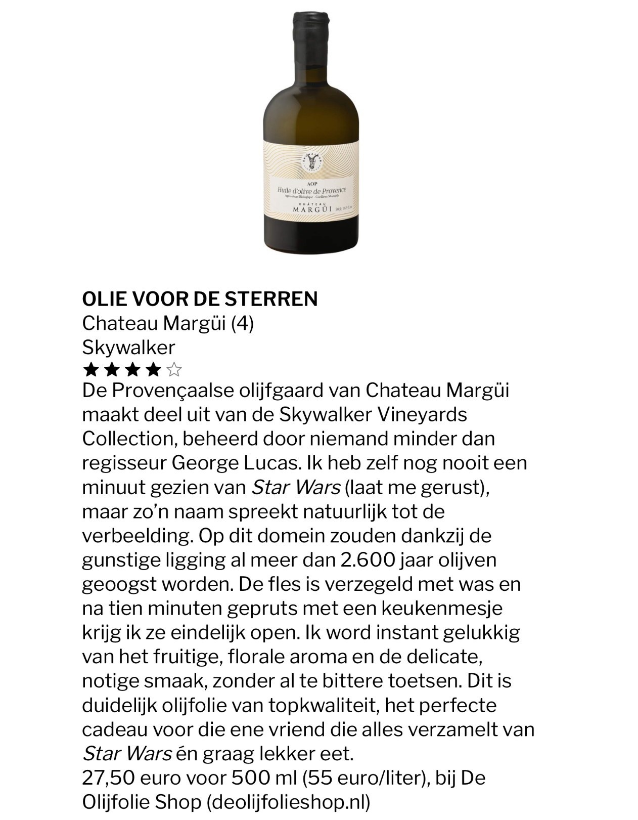 Das köstliche französische Olivenöl extra vergine stammt aus der Provence vom das Chateau von George Lucas. Gepresst aus den 5 typischen französischen Olivensorten Picholine, Aglandau, Cayon, Cayet, Bouteillan und Grossane. Lesen Sie mehr
