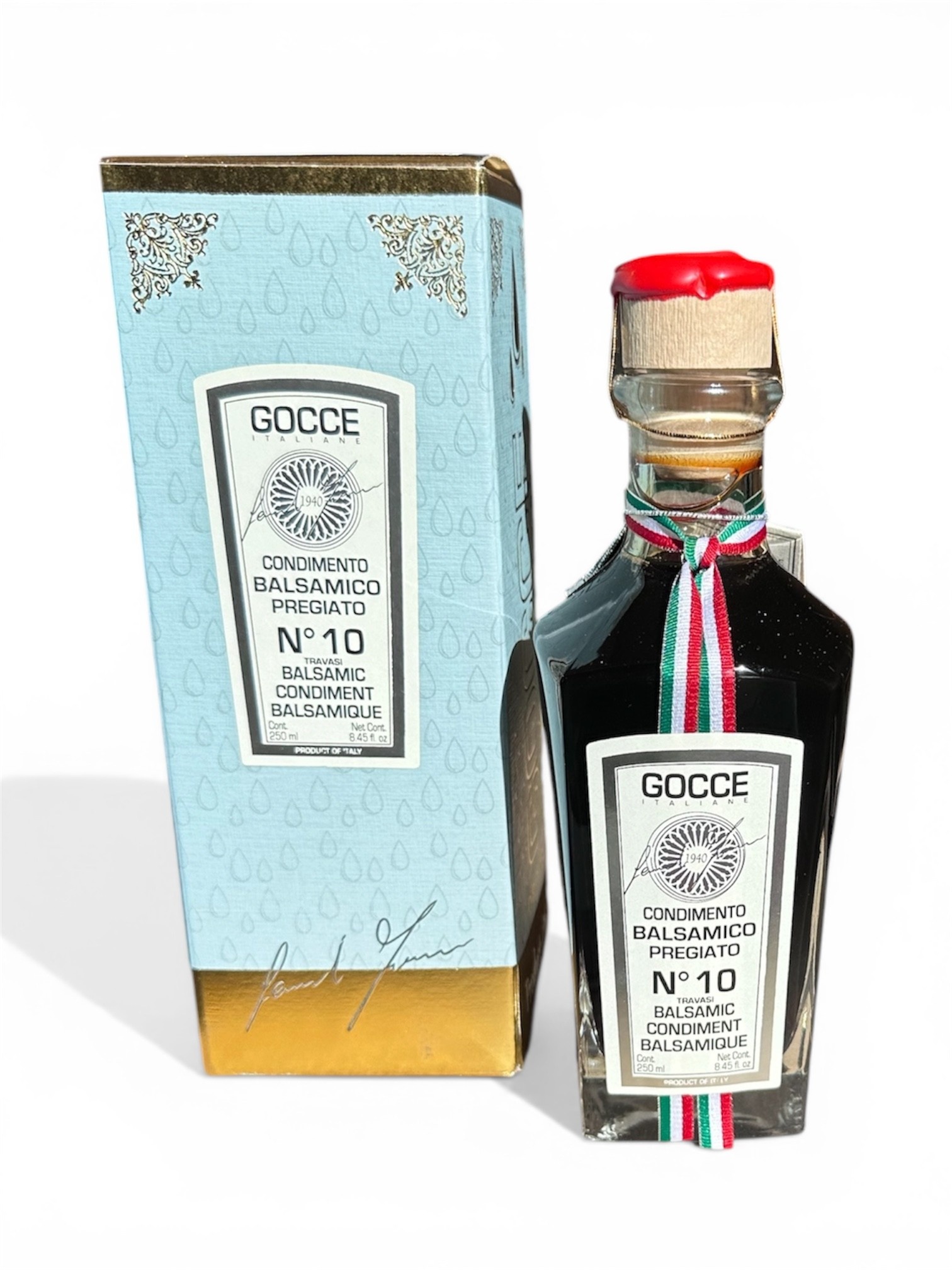 Gocce Balsamic Dressing Pregiato Serie 10 is een verfijnde balsamico die maar liefst 10 jaar rijpt in houten vaten. Het resultaat is een zijdezachte structuur met een perfecte balans tussen zoet en zuur, en een rijke, complexe smaak met tonen van rijp fruit en hout.